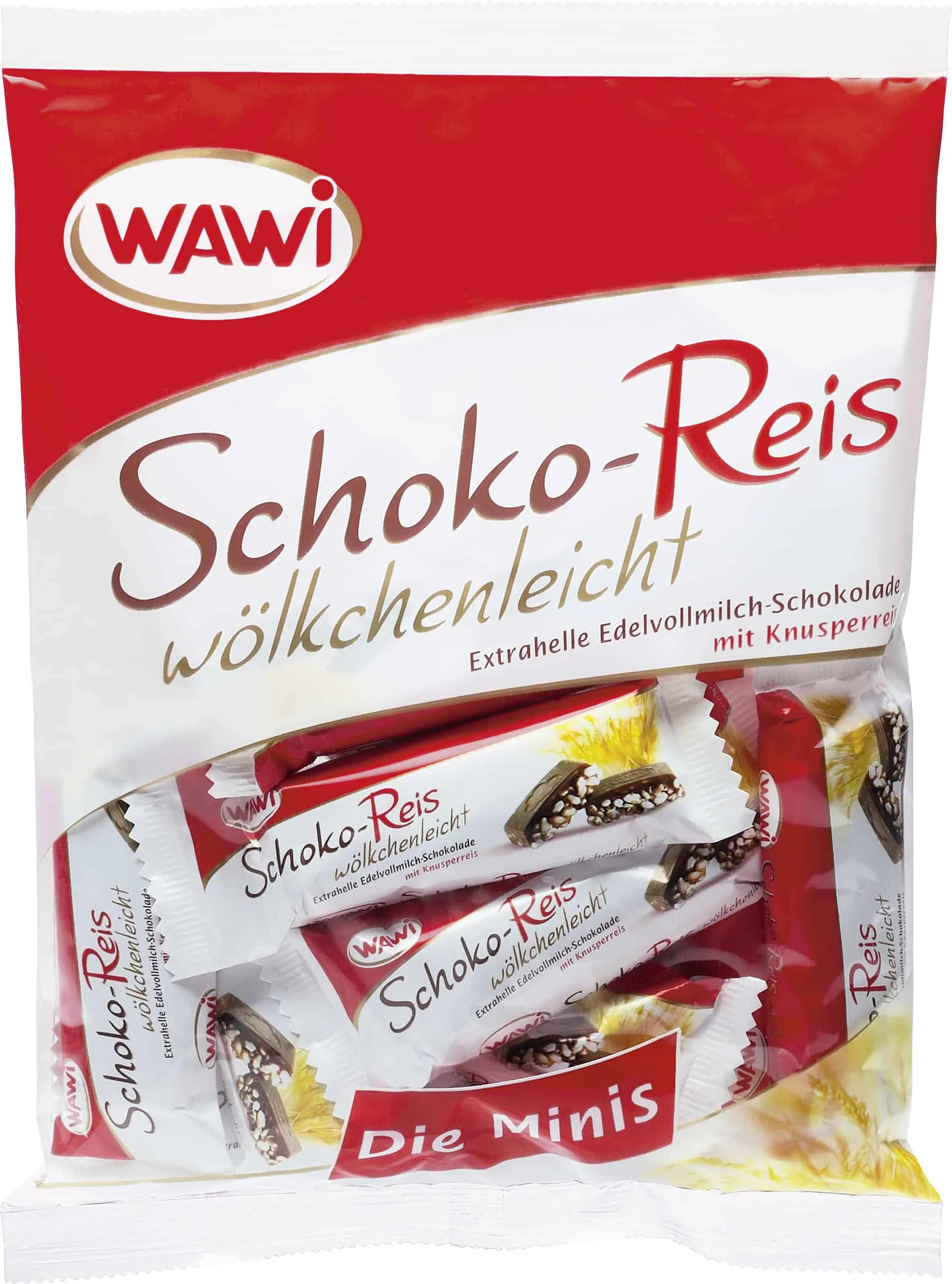 Die Minis von Wawi. Klein, fein, knusprig, zartschmelzend: Die Wawi Schoko-Reis Wölkchenleicht Minis verbinden alles auf einmal. Die feinen Happen bestehen aus extraheller Edel-Vollmilch-Schokolade und gepufftem Reis, der besonders schonend geröstet wird, damit er luftig und locker bleibt. Und die knusprigen Crispies sorgen für den richtigen Biss. Einzeln verpackt ergibt das kleine Portionen edelsten Genusses.