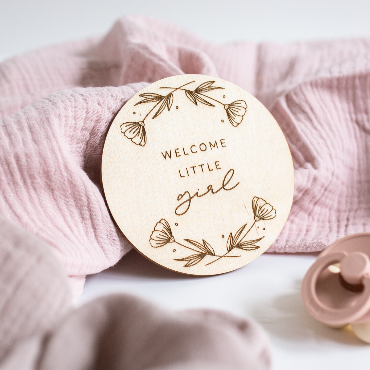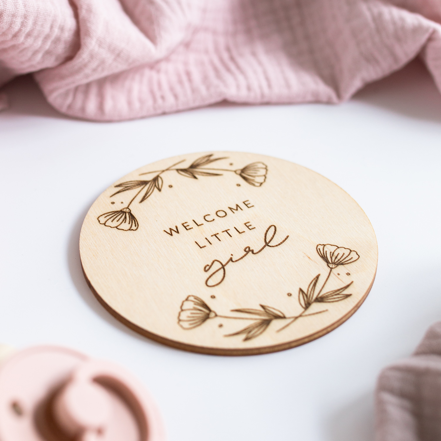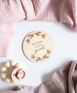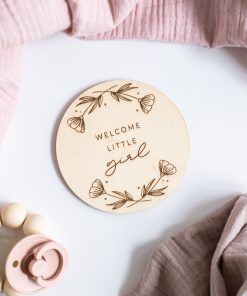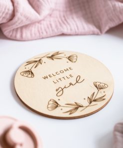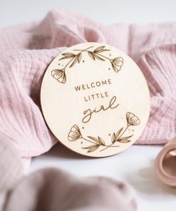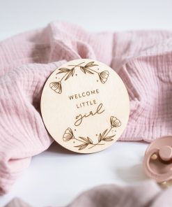 Eine lasergravierte Holzscheibe mit dem Spruch “Welcome little girl”, mit der ihr viele aufregende & emotionale Ereignisse kreativ festhalten könnt.