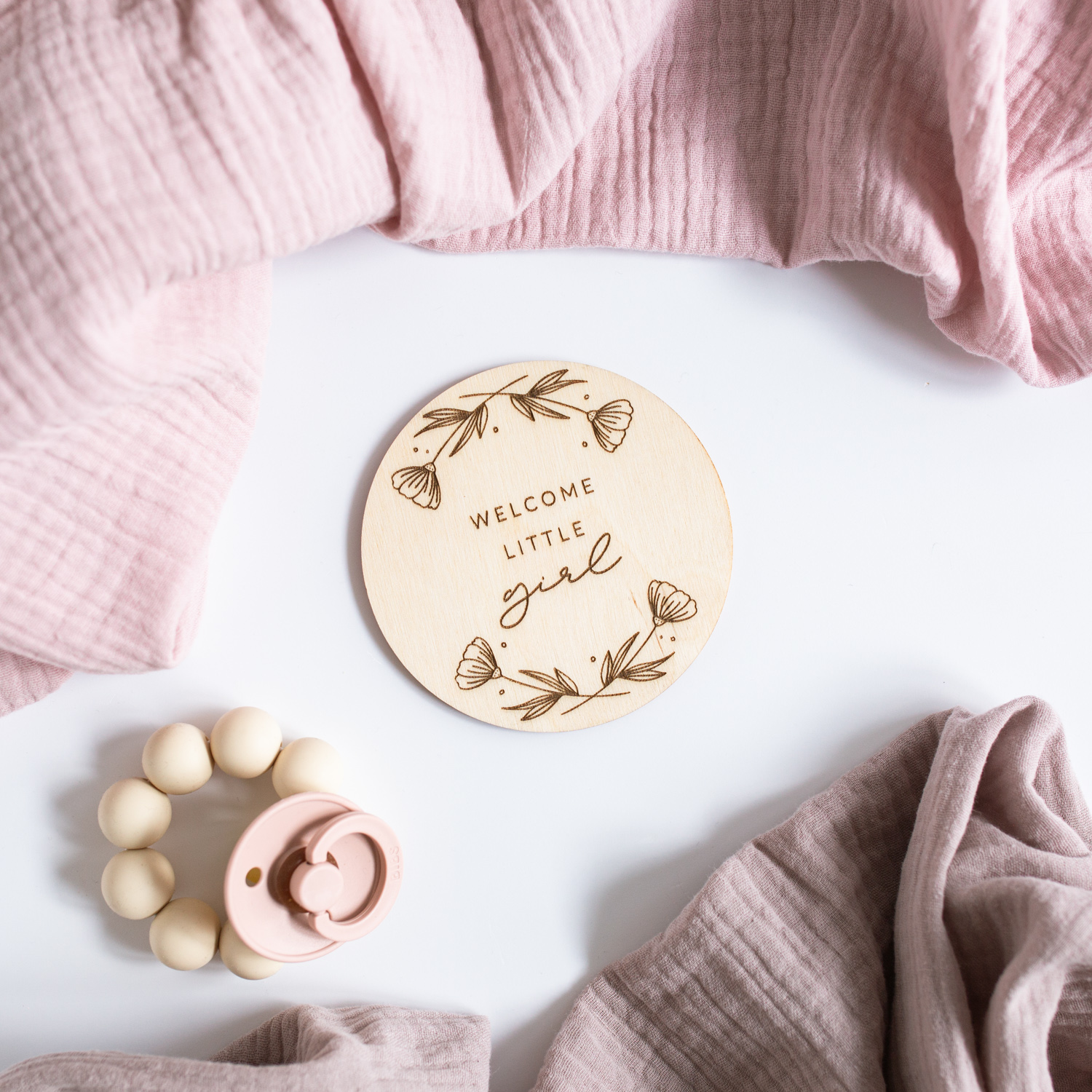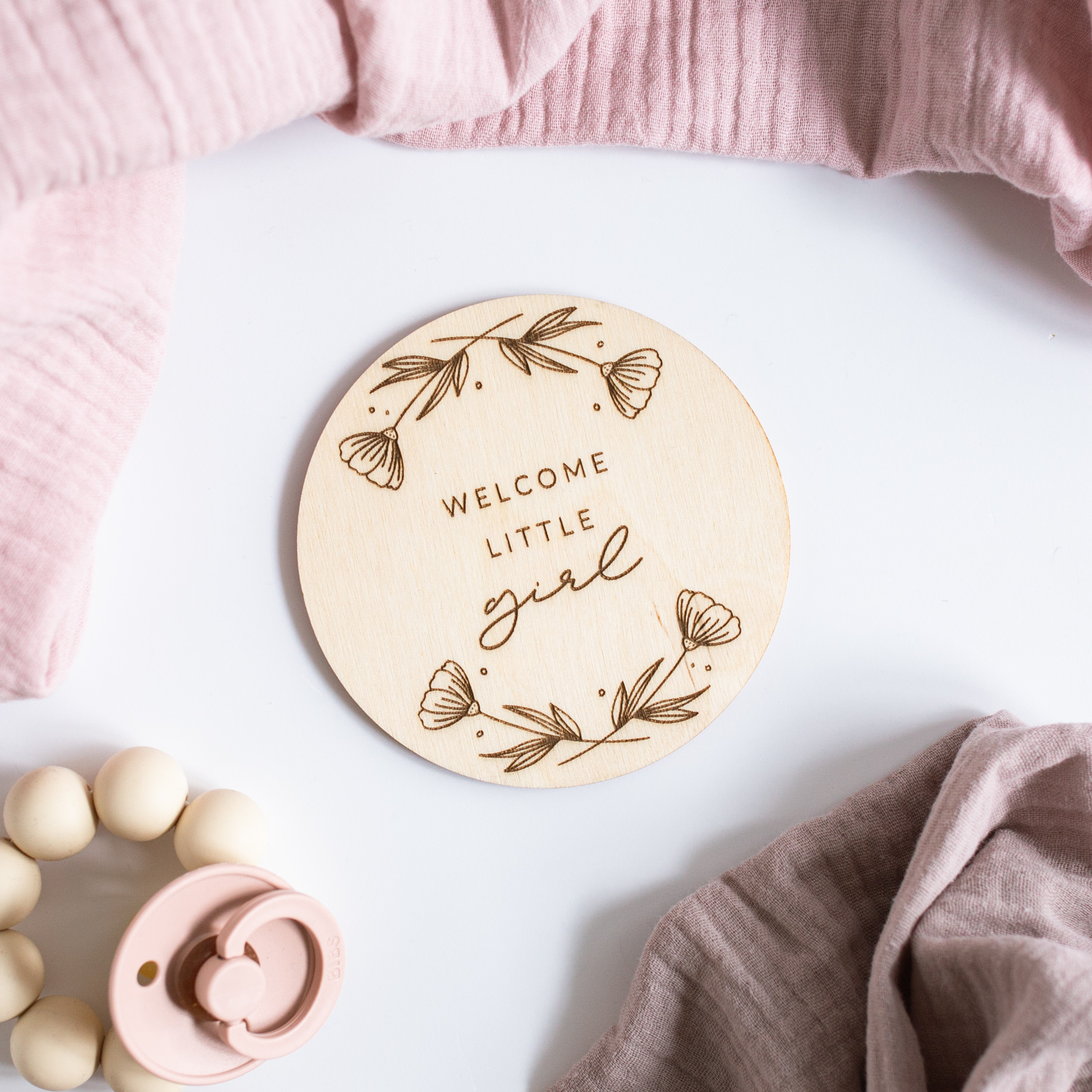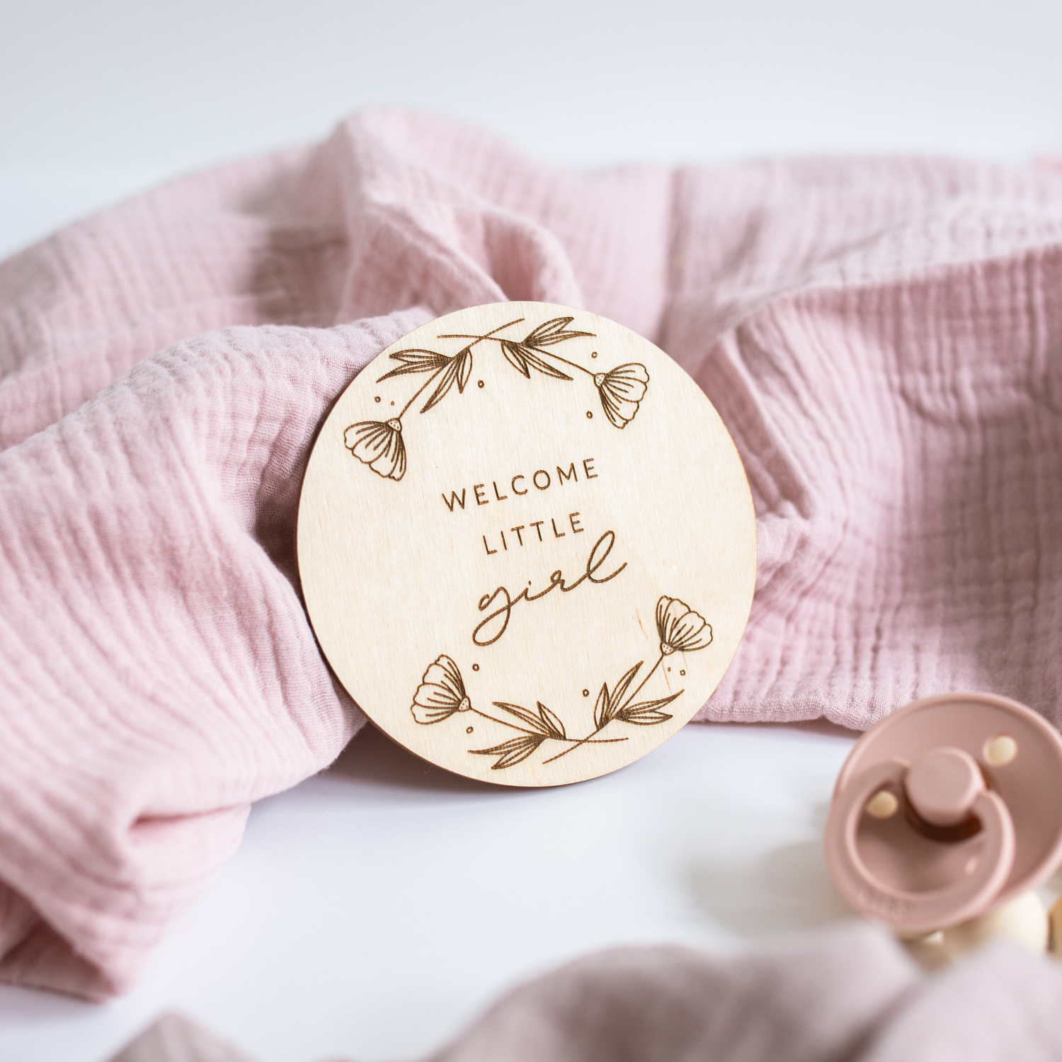 Eine lasergravierte Holzscheibe mit dem Spruch “Welcome little girl”, mit der ihr viele aufregende & emotionale Ereignisse kreativ festhalten könnt.
