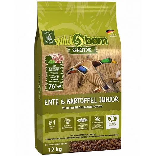 25% frische Ente, 19% getrocknetes Entenfleisch, Kartoffelflocken, Kartoffelstärke, Entenhydrolysat, Kartoffeleiweiß, Rübenschnitzel (entzuckert & getrocknet), Bierhefe (getrocknet), Leinsamen, Fischöl, Zellulosefasern, Natriumchlorid, Mannan Oligosaccharide, Kaliumchlorid, 0,01% Tausendgüldenkraut